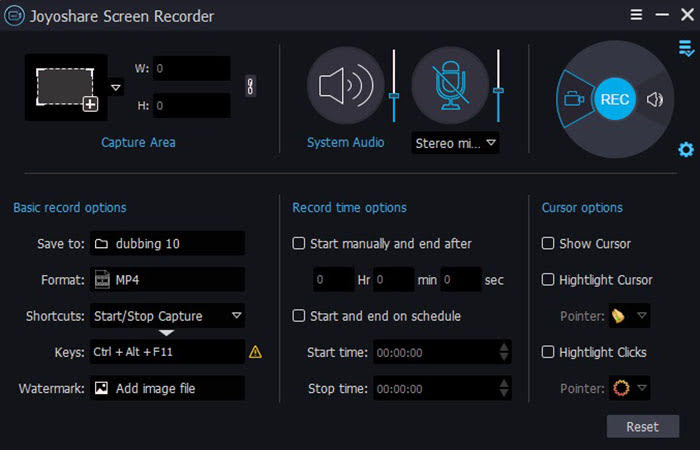 This recording tool provides a dual-mode for you to choose, allowing you to record your sound from the system and microphone simultaneously or separately. You can customize frame rate, bitrate, resolution, quality, and more when you change output formats. It gives you options to save your recordings in a format compatible with YouTube, Vimeo, Facebook, etc. as it supports multiple formats. You can also add a watermark to protect your copyright and add pointers to highlight your cursor and clicks. To save your time, all you need to do is set start and stop time.
